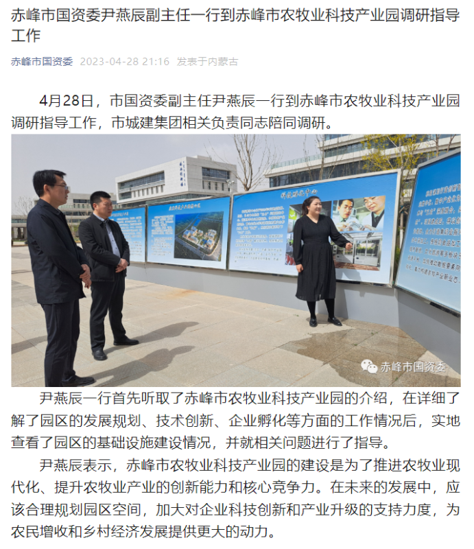 赤峰市國資委尹燕辰副主任一行到赤峰市農牧業(yè)科技產(chǎn)業(yè)園調研指導工作