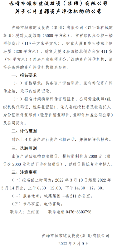 赤峰市城市建設投資(集團)有限公司 關于公開選聘資產(chǎn)評估機構(gòu)的公告