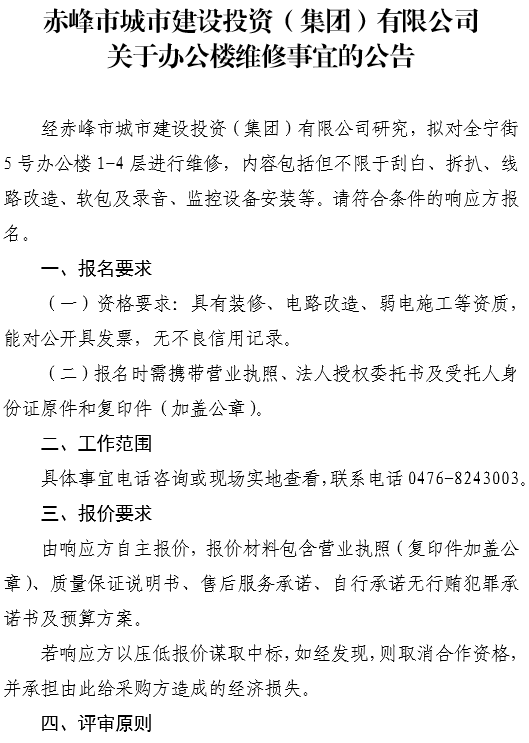 上一篇:赤峰市城市建設(shè)投資(集團(tuán))有限公司 關(guān)于公開選聘代理機(jī)構(gòu)入庫的公告