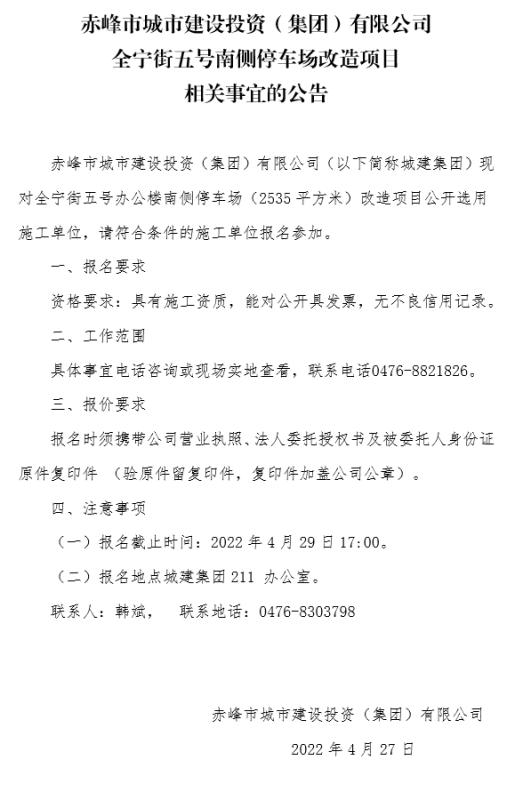 赤峰市城市建設(shè)投資(集團(tuán))有限公司 全寧街五號(hào)南側(cè)停車場(chǎng)改造項(xiàng)目 相關(guān)事宜的公告