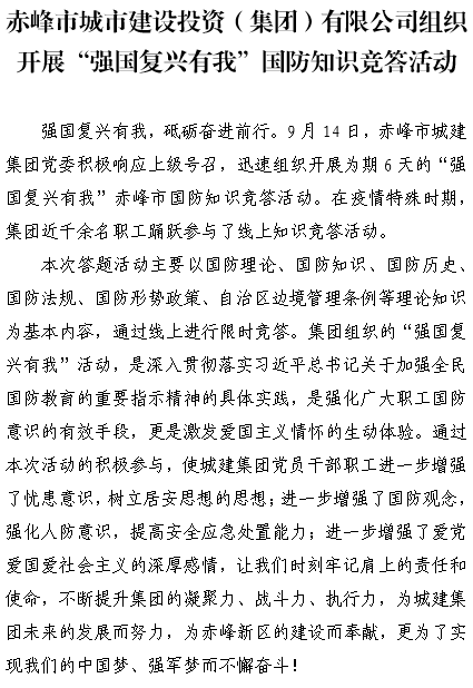 赤峰市城市建設(shè)投資(集團(tuán))有限公司組織開展“強(qiáng)國復(fù)興有我”國防知識競答活動(dòng)